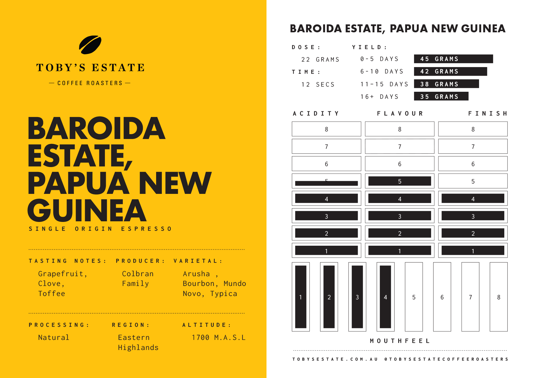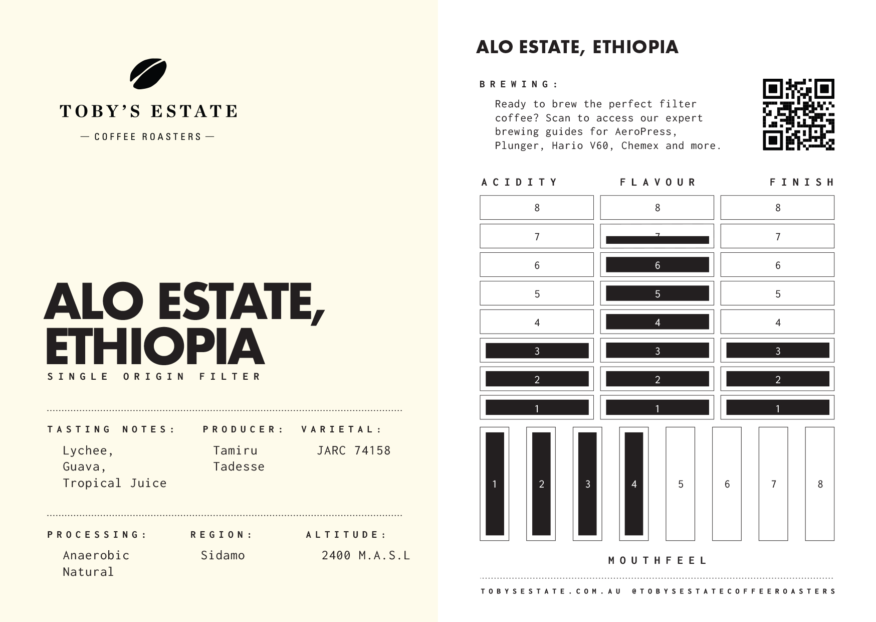This naturally processed lot is fermented and dried slowly on raised beds, producing Alo’s signature “mini” beans — small in size, big in flavour. Expect an exceptionally vibrant, fruit‑forward cup with real personality.