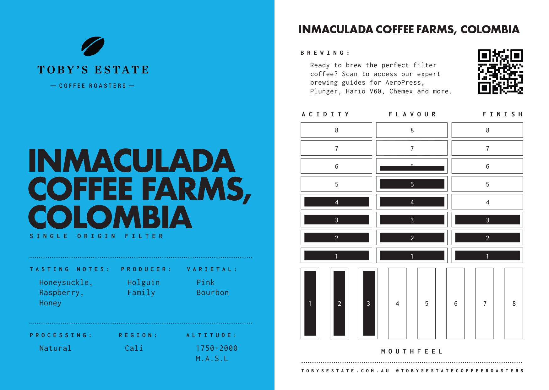 Inmaculada sits high in the Andes in Pichindé, surrounded by the lush biodiversity of the Farallones de Cali Natural Park. The Holguín‑Ramos family established the farm in 2010, focusing on rare varieties and meticulous processing across four micro‑farms with their own microclimates.