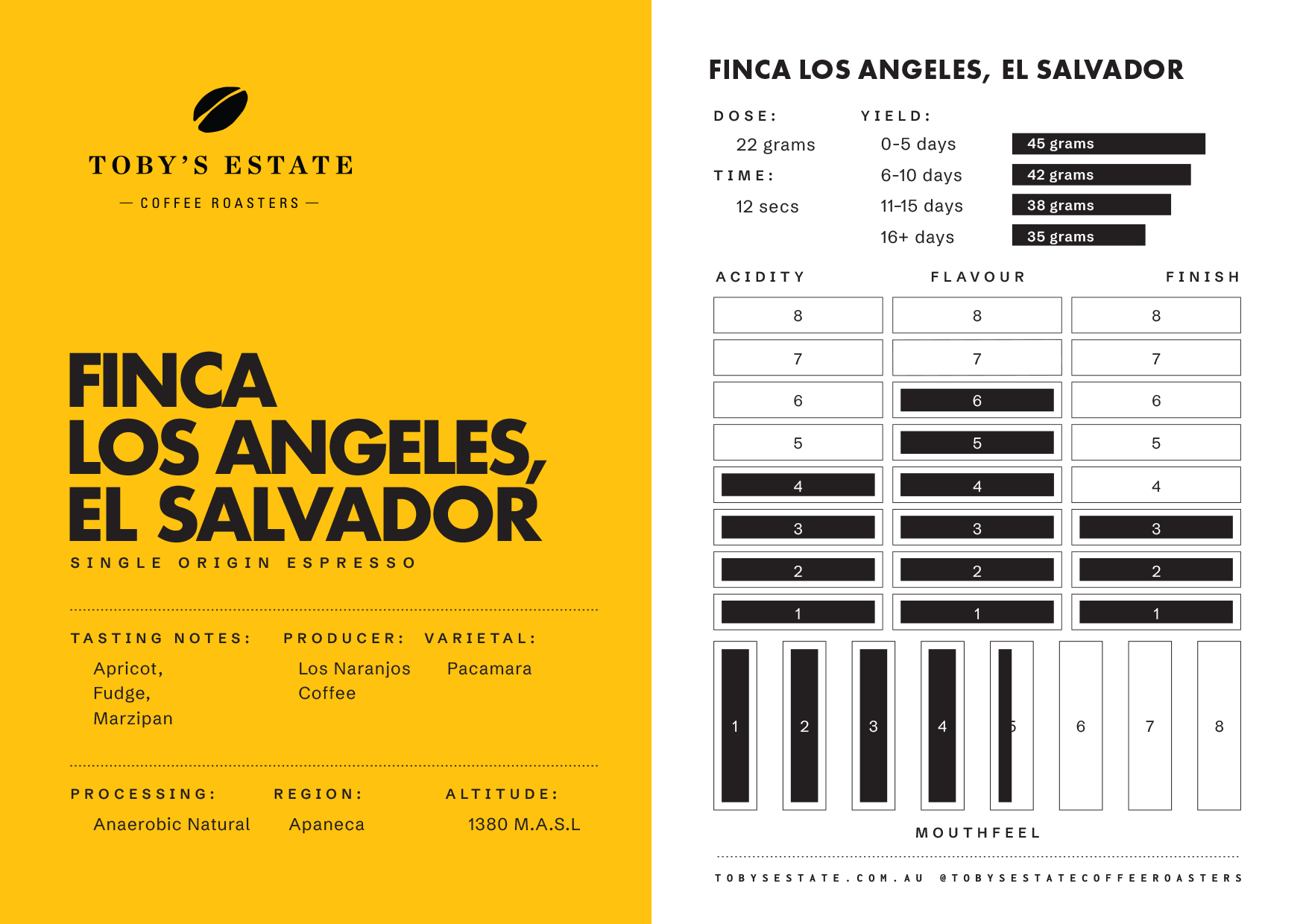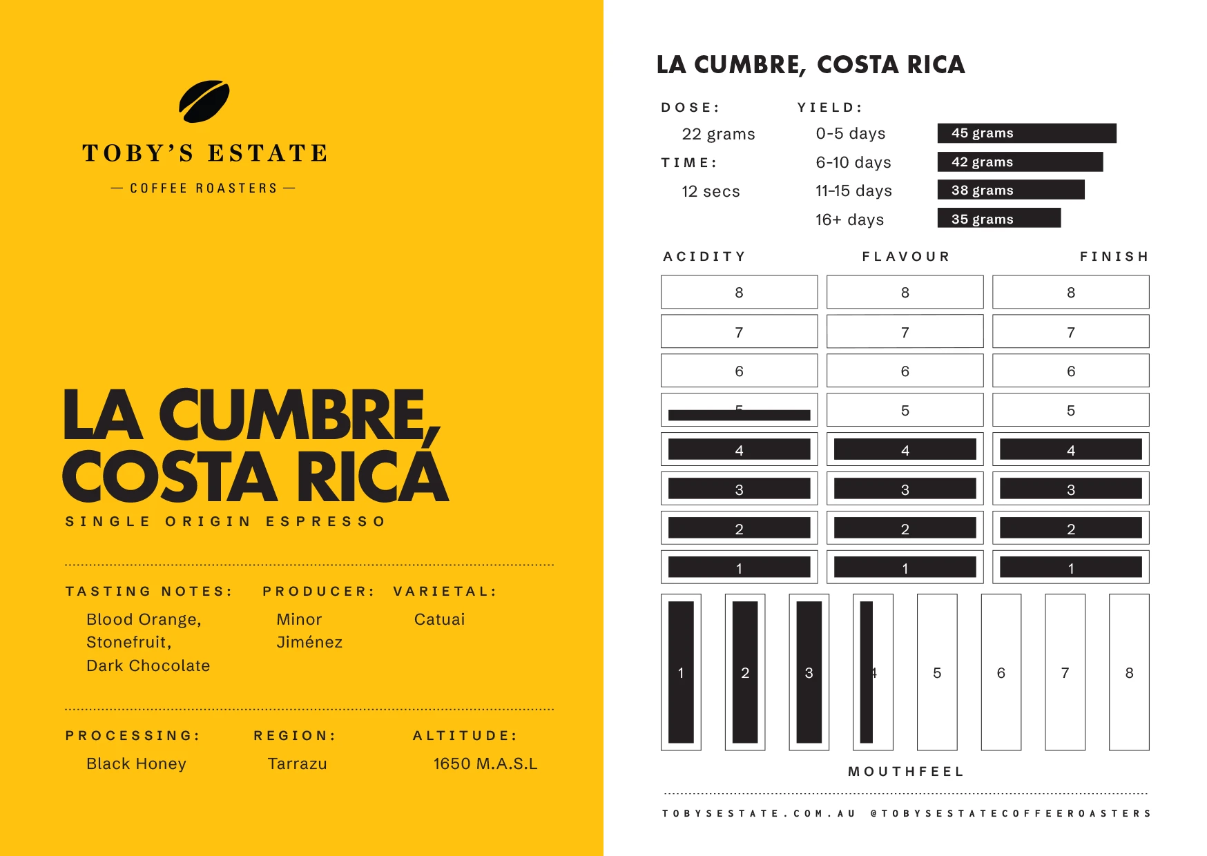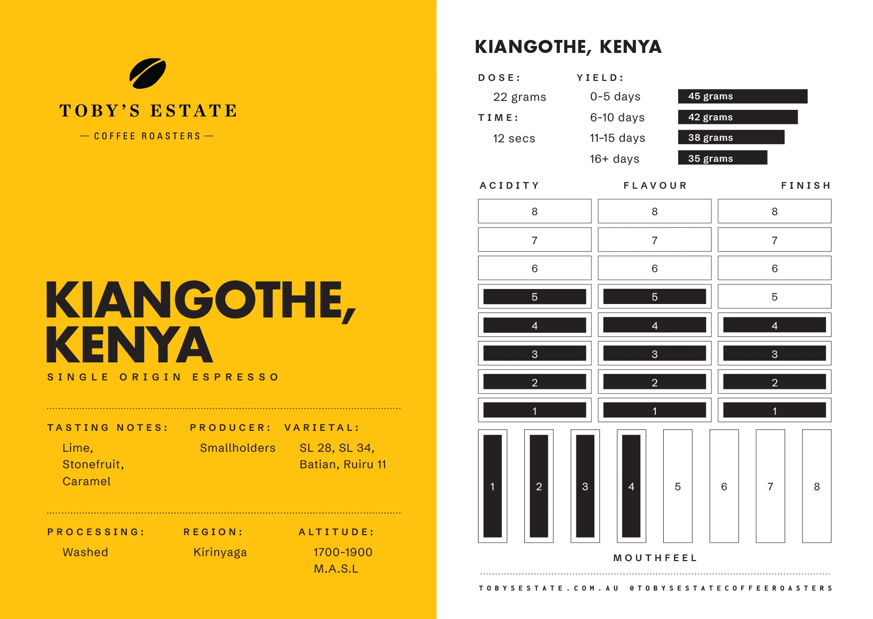 Kiangothe is a classic Kenyan — dark chocolate and milk chocolate up front, with caramel running through and a sweetness that holds as it cools. There’s a bright acidity in there too, so if that’s your thing, this one delivers.