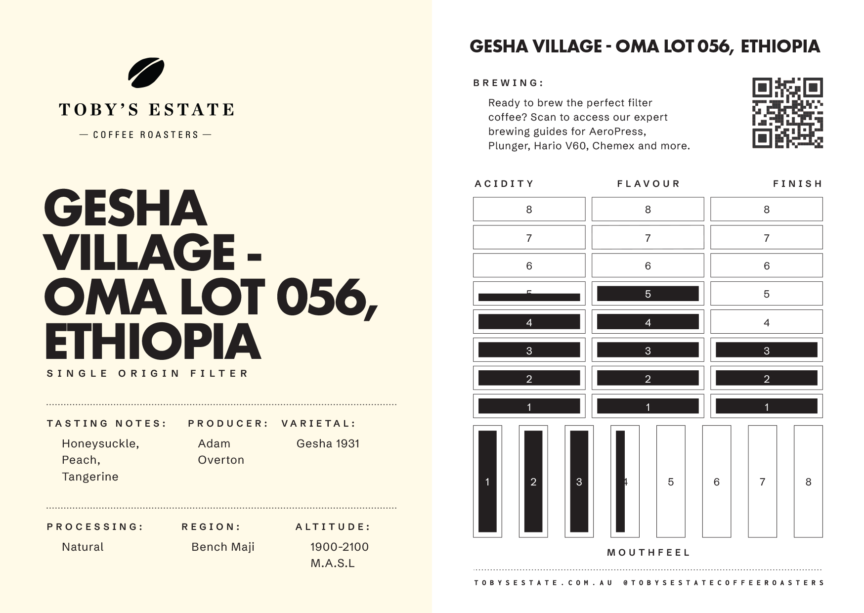 Gesha Village was established in 2011 by Adam Overton and Rachel Samuel in a pristine forest environment selected for its altitude, rainfall, and soil. The farm is divided into multiple blocks based on microclimate and variety, with each lot carefully tracked from harvest through to export.