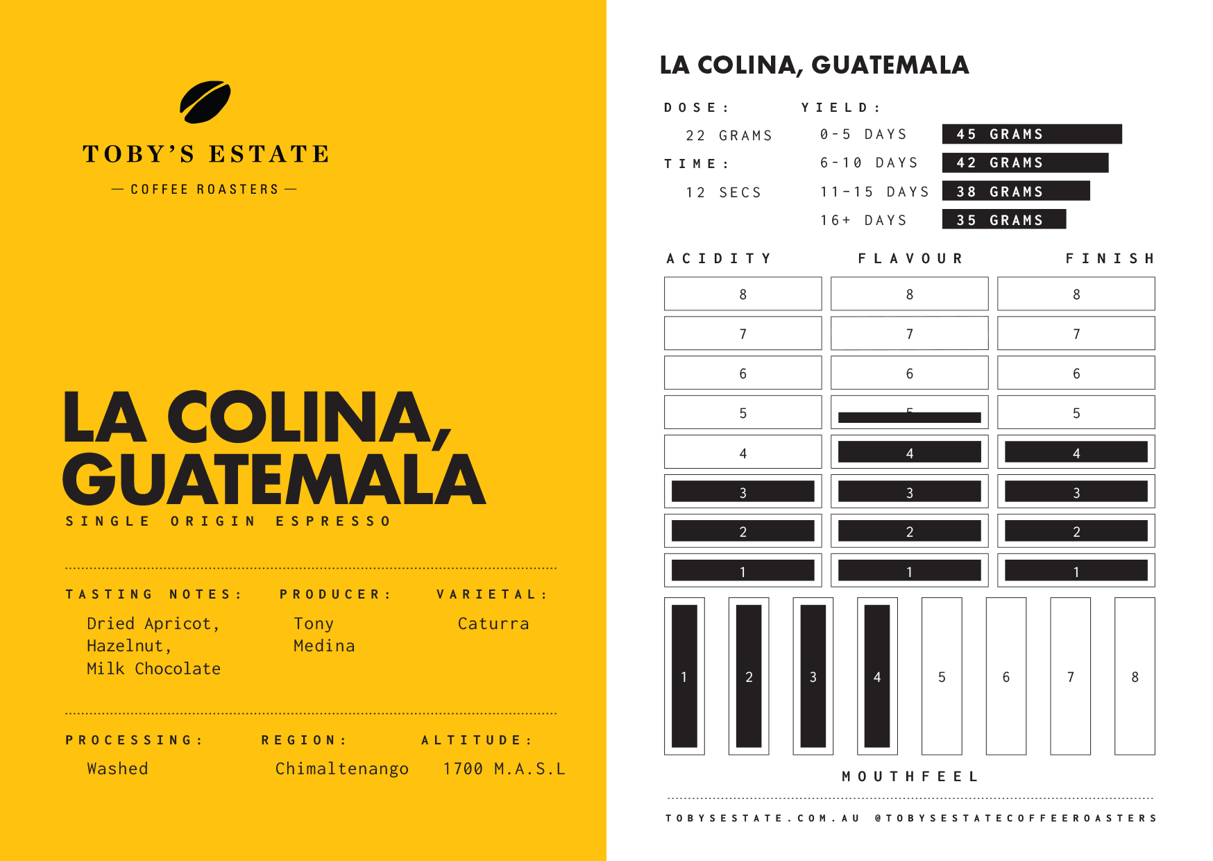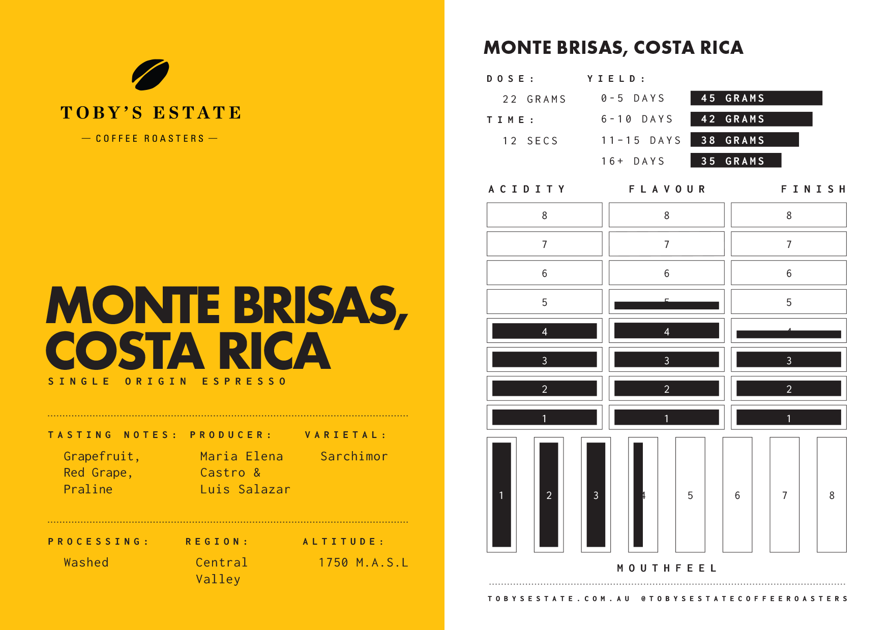 There’s a familiarity that echoes Monte Brisas’ natural lots, but with more clarity and less funk - bold, vibrant, and controlled. That intensity gives baristas plenty to work with - whether it’s stretched at longer ratios when fresh, or brewed after some rest to bring things into clearer focus with a higher dose.