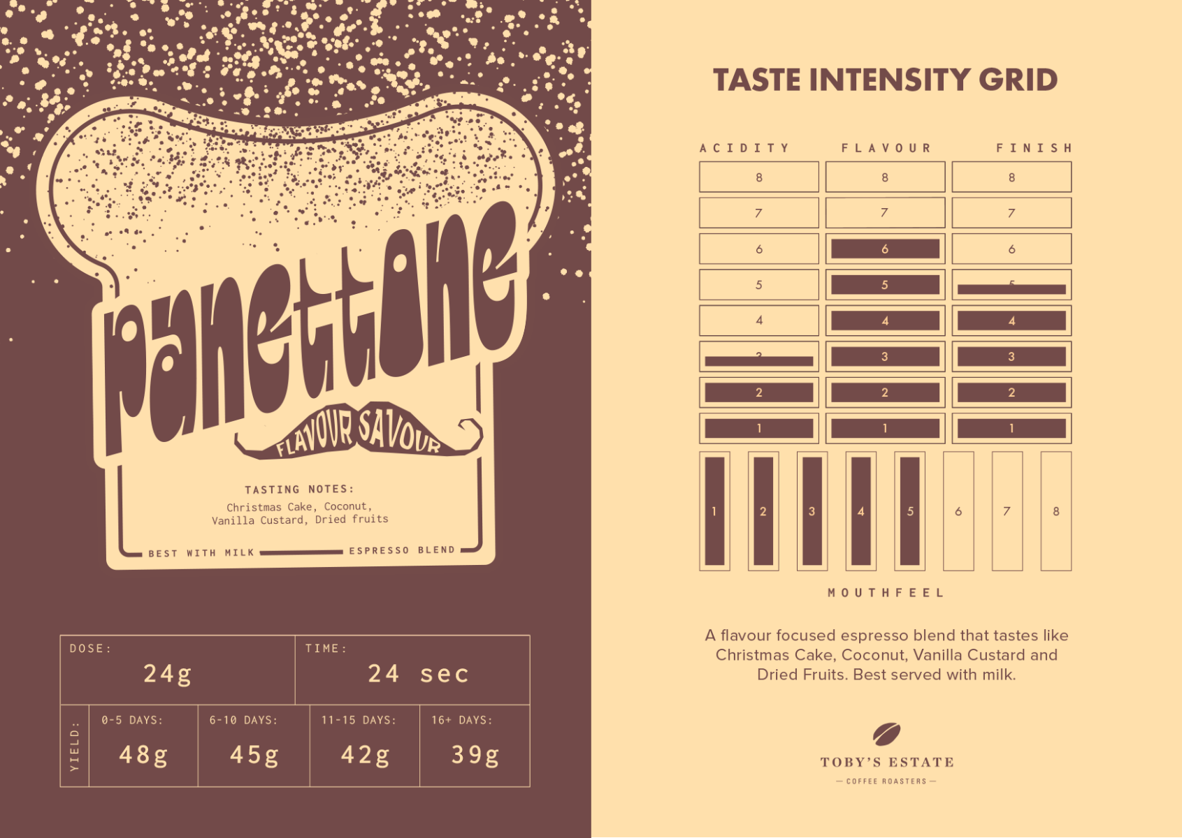 Panettone is all about 3 key components: Christmas Spices and Mixed Fruit infused coffees, a Colombia mix and most importantly - coffee roasting finesse.