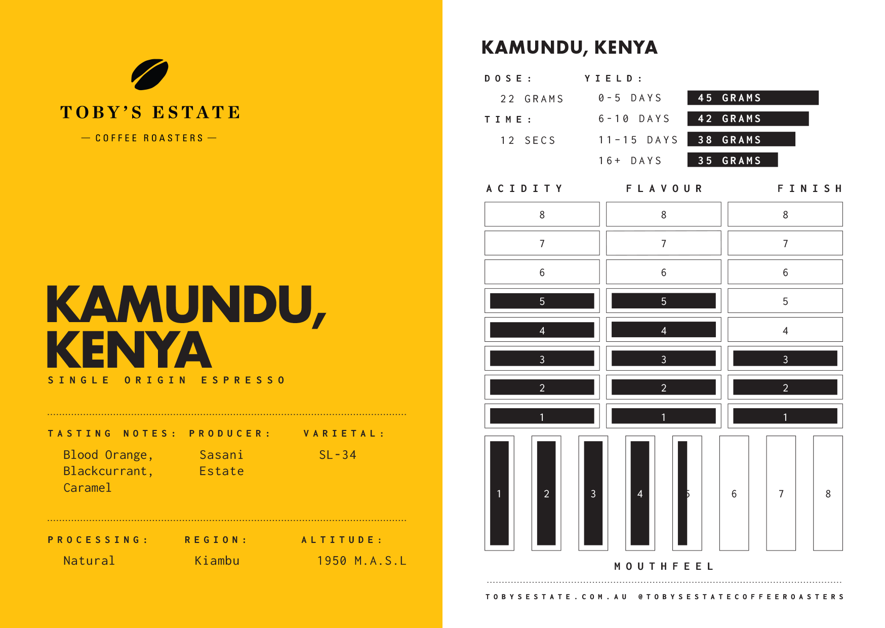 Selected cherries are dried slowly on raised beds for up to 6 weeks, turned carefully to ensure a consistent drying process, and covered at night and during rain to protect against moisture damage. Structured, complex, and distinctly Kenyan, this natural lot is a standout.
