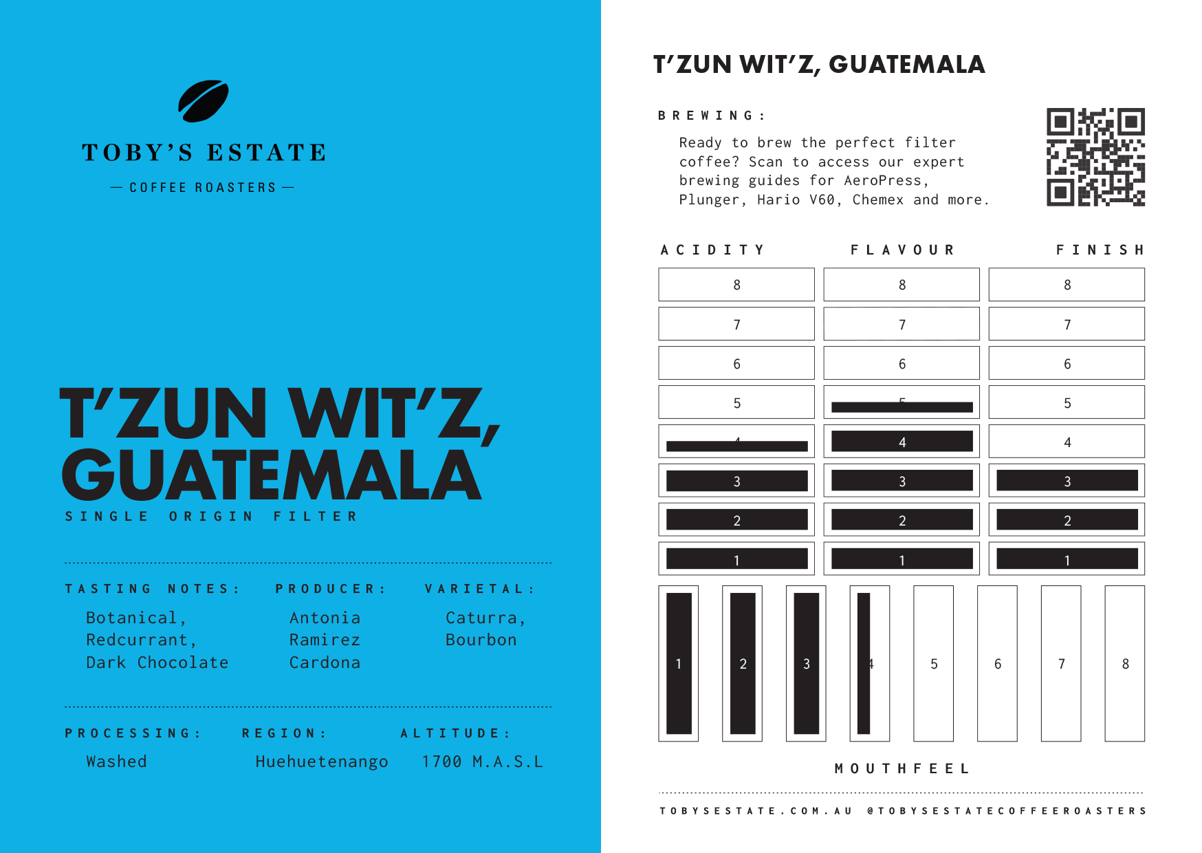 This one’s classic Guatemalan through and through: silky, creamy, rich, sweet, with a lower acidity than you’d expect from the region. It’s the kind of coffee made for sharing - easy to brew, easy to love, whether you drink it black or with a dash of milk.