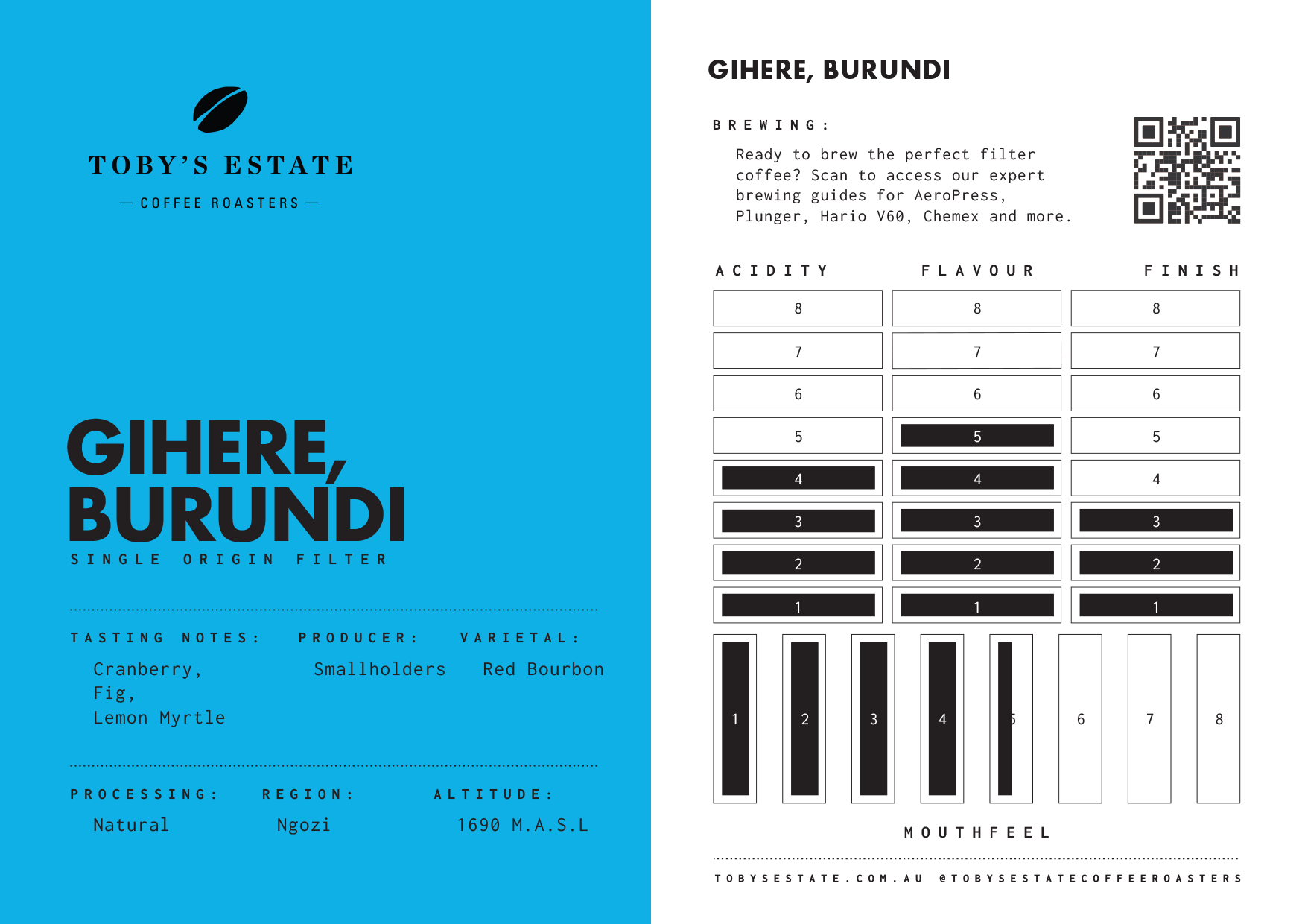 Managed by Bugestal, Gihere works with over 15,000 farmers across Ngozi and Muyinga provinces. This natural-processed filter lot is floated, hand-sorted, and dried slowly over 3–4 weeks. The cup reveals cranberry, fig, and lemon myrtle — expressive and carefully curated.