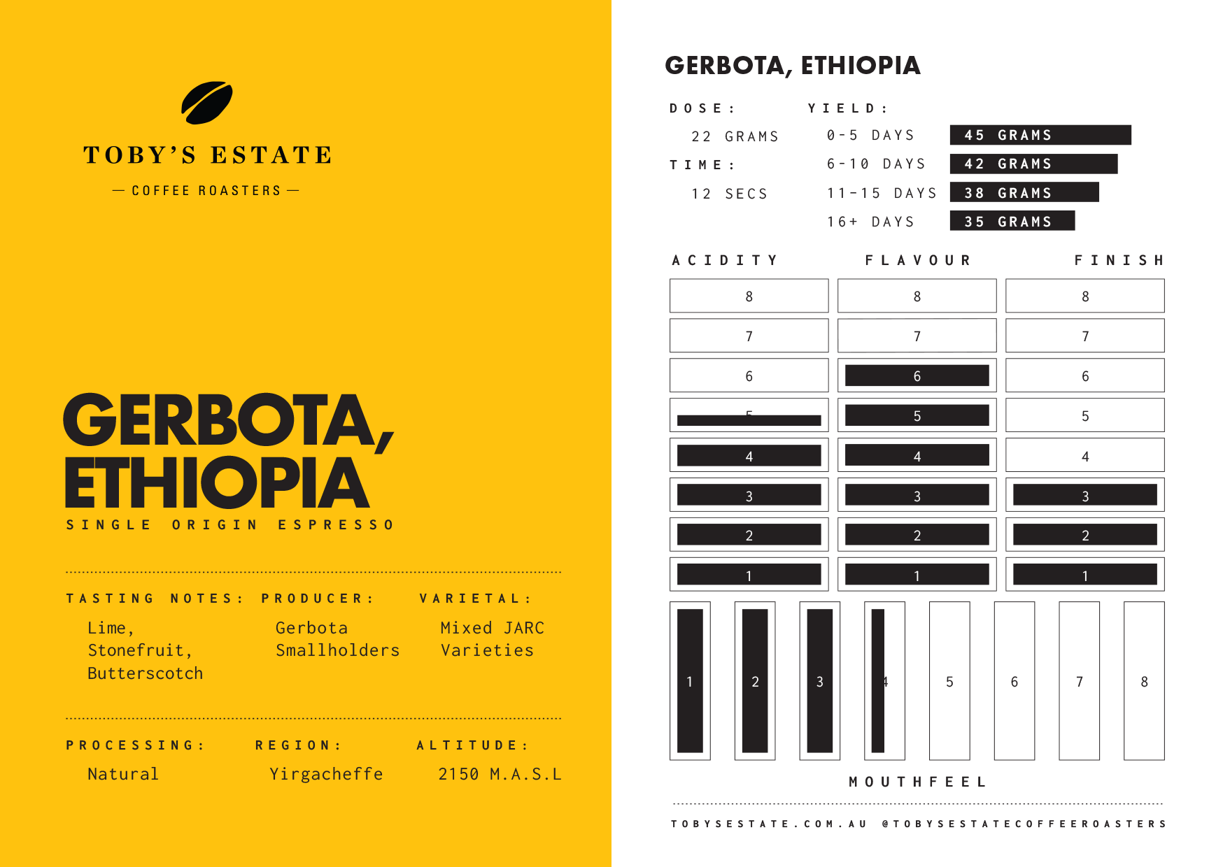 Grown by the Abebe Mulugeta producer group high in Yirgacheffe (2,100–2,150 m), this natural espresso is the product of hand-selected cherries and 12–17 days of rigorous drying. The result is a sweet, dense cup with lime, stonefruit, and butterscotch notes.