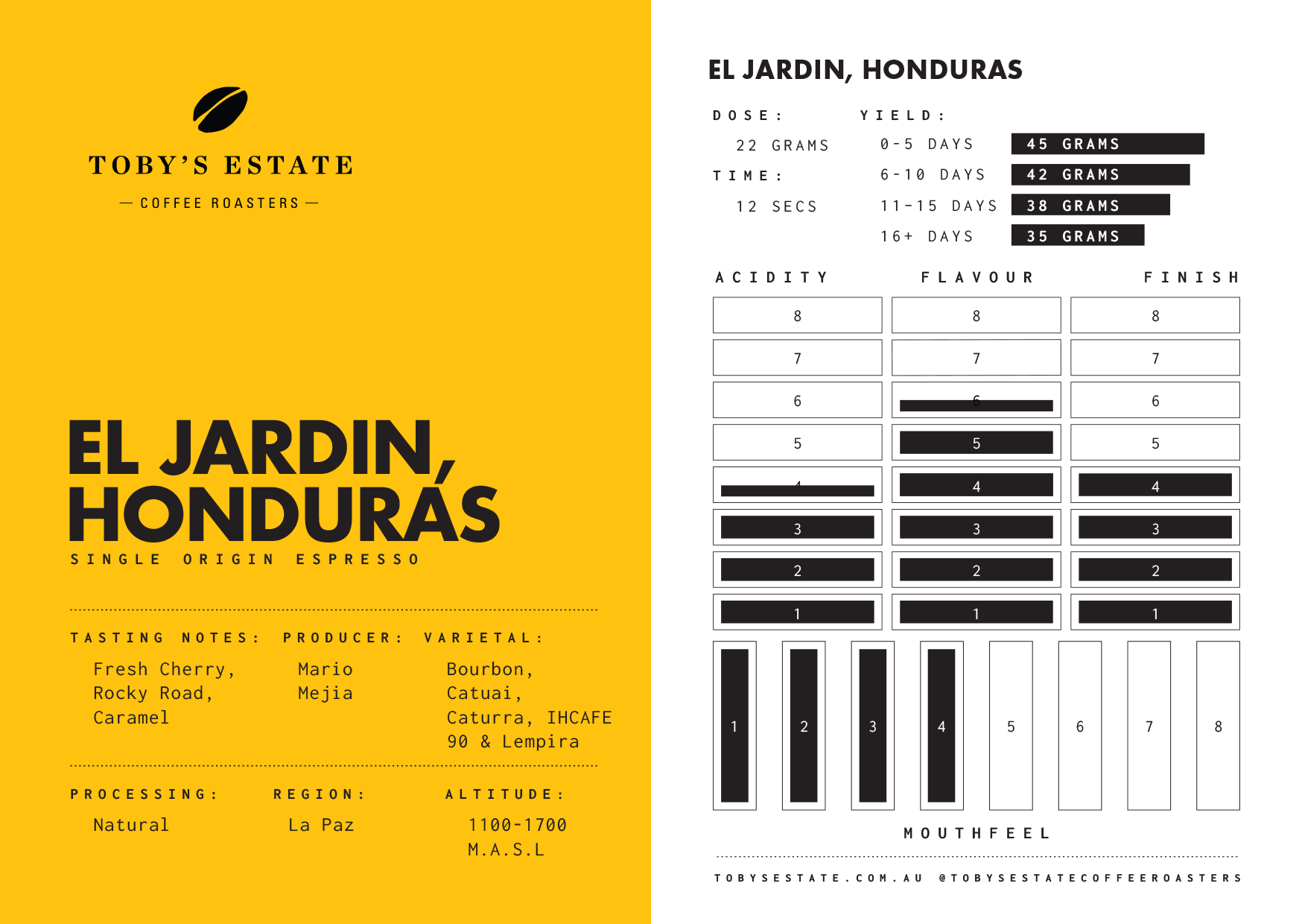 A highlight of our October espresso offering, this natural lot from Mario Mejía’s Finca El Jardín is bold and comforting. Through slow drying on raised beds, it develops flavours of fresh cherry, rocky road, and caramel. Mario’s experimental approach to variety trials—and his commitment to agroforestry—makes this more than just a cup.