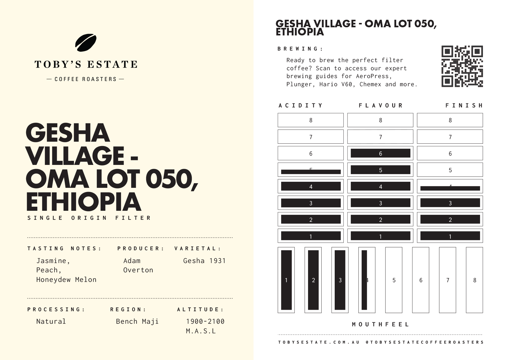 Sourced from the estate planted next to the original Gori Gesha Forest, this natural filter is deeply rooted in Gesha lineage. Every cherry is tracked to its block, and beans are dried slowly to preserve complexity. Flavours of jasmine, peach, and honeydew melon shine.
